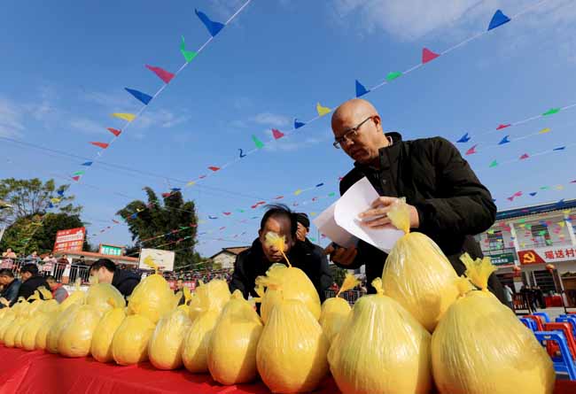 近日,在广西柳州市融安县长安镇瑶送村,工作人员展示参加擂台赛的柚子。当日,广西柳州市融安县长安镇瑶送村举行第一届柚子节暨2020决战脱贫攻坚“脱贫感党恩 奋进新起点”主题教育活动。在柚子节上,当地政府组织开展柚子打擂比赛,农业技术人员通过对果实外观、大小、称重、糖度等项目的评比,评选出今年的“柚子王”,通过柚子打擂,进一步提升柚子的知名度和美誉度,帮助脱贫群众解决柚子销售难题,实现稳定脱贫、高质量脱贫。