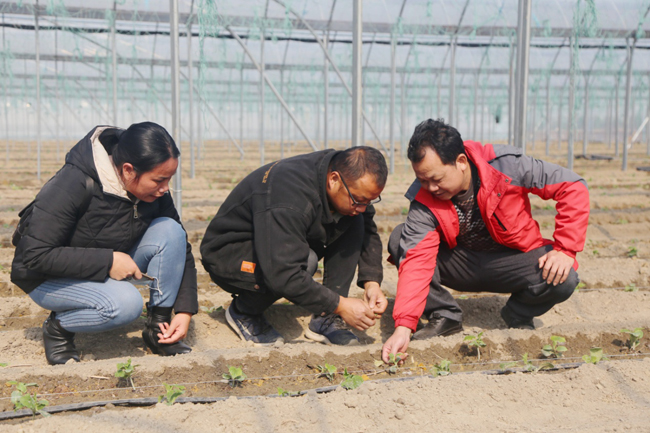 技术人员在蔬菜大棚里对刚种下的青瓜进行技术指导