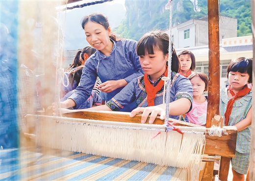 凌云县下甲镇弄福村壮族妇女向学生传授织布工艺。李彩兰/摄