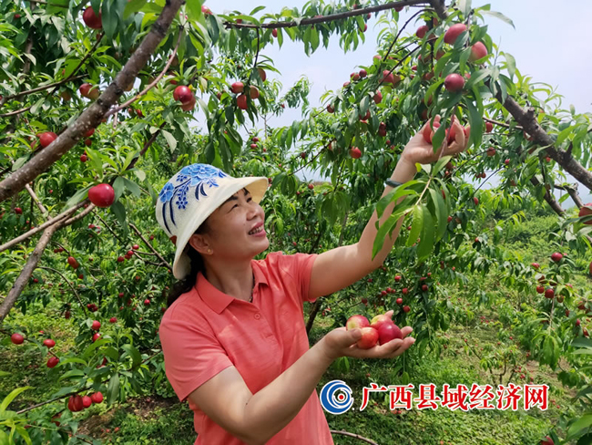 眼下,大量油桃陆续成熟上市,在天峨县六排镇龙坪村隆秀灿家里摆满了一筐筐的油桃,工人忙着选果、装车。果园内,红彤彤的油桃挂满了枝头,硕果累累,惹人“桃”醉,工人穿梭其中忙着采摘,一派丰收的景象。