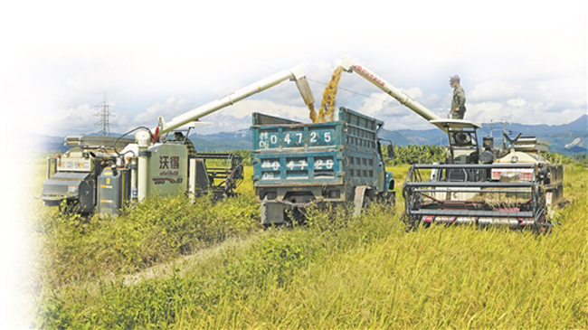 在樟木镇富硒优质稻核心示范区,收割机正忙着收割早稻。