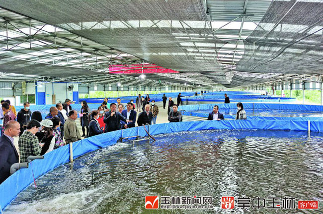 图为参会人员参观福绵区百果丰高密度工厂化养鱼示范基地。