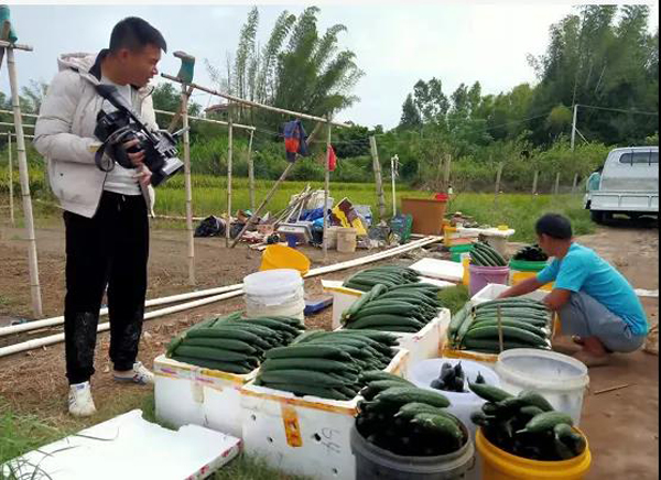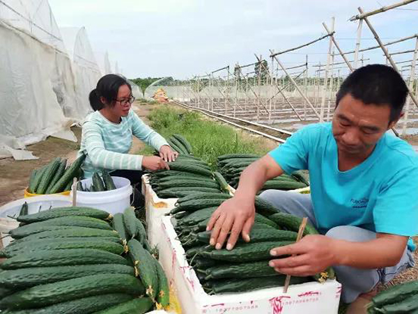 日前,银海区平阳镇三合口农场社区居民朱战兵、苏艳婷夫妇在位于福成镇三合口村委的大棚种植基地旁边整理刚刚收获的青瓜。由于使用大棚设施种植,其产品具有农残低、商品率高等特点,当日收购价达到10元/公斤,为近年来难得的好价钱。