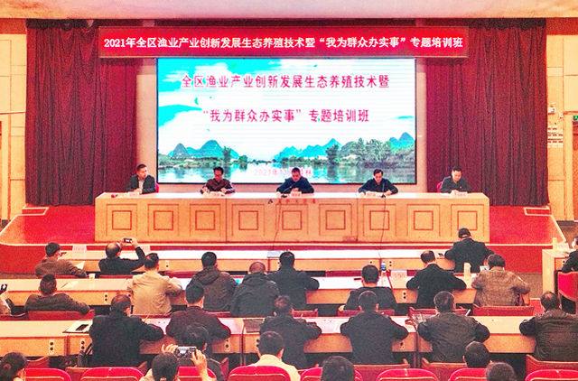 为贯彻落实自治区人民政府《关于加快推进广西现代特色农业高质量发展的指导意见》,巩固深化党史学习教育“我为群众办实事”实践活动,不断提升渔业新型生产主体综合素质,11月8-10日,自治区农业农村厅在桂林市举办2021年全区渔业产业创新发展生态养殖技术暨“我为群众办实事”专题培训班,自治区农业农村厅二级巡视员罗春业出席开班仪式并作讲话。