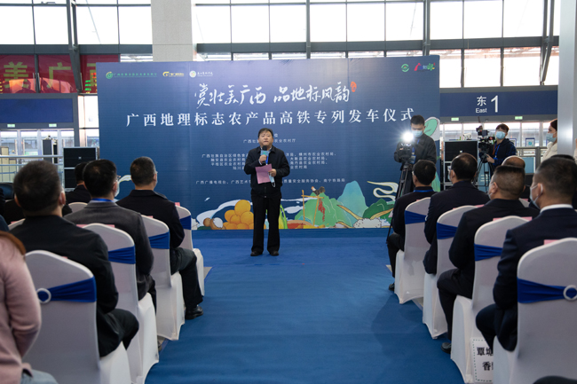 11月26日,广西地理标志农产品高铁专列发车仪式在南宁市火车东站举行。活动由自治区农业农村厅主办、2021年广西地理标志农产品保护工程实施主体的10个市、县(市、区)农业农村局、海洋局共同承办。自治区农业农村厅一级巡视员王凯学,广西艺术学院党委常委、副校长韦俊平,广西广播电视台台务会成员、总经理室主任曹兵出席发车仪式并致辞。