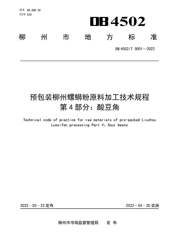 2021年7月,柳州市启动柳州螺蛳粉市级地方标准制定工作;8月,行业主管部门提出《预包装柳州螺蛳粉原料加工技术规程 第4部分:酸豆角》地方标准的立项申请;9月29日,柳州市市场监督管理局组织专家对该标准进行立项答辩并通过立项评估;2022年3月22日,经过充分调研、广泛征求意见、技术审查、报请审批等严格的程序,该标准正式获批准发布。