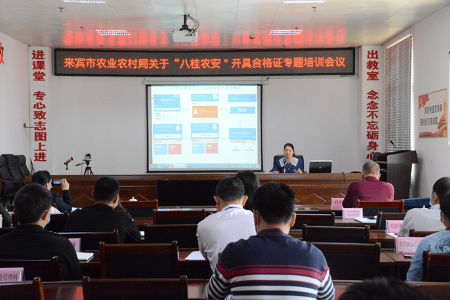 培训会上,来宾市高级农艺师韦应贤和高级兽医师银少华分别培训了“八桂农安”系统开具食用农产品合格证、《食品中农药最大残留量》GB2763-2021、农药科学使用、兽药科学使用和解读广西食品安全示范创建现场评审操作指南(2021版)。