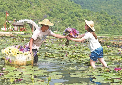 柳江区在百朋荷苑景区发展“赏花经济”的同时,打造本土特色的旅游产品,以旅游促花茶产业发展,让香水莲成为“小康花”,形成产业互动融合的新型产业模式。眼下,九品香水莲花迎来花期,村民采摘、加工莲花茶忙。