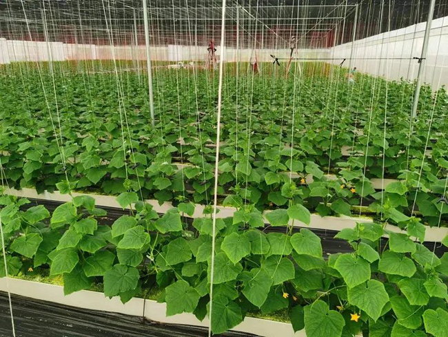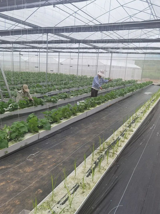 初到邕宁区蒲庙镇光和村特色岩植高效智慧无土栽培产业基地,齐整如一的种植槽,一颗颗绿色作物生机盎然,整洁干净的种植环境让人眼前一亮。基地规划面积50亩,现已建成4栋连片大棚,每栋大棚连片面积5亩种植槽面积约2000米,主要种植水果黄瓜,试验种植水稻,其中一栋大棚已于5月21日投产种植,预计6月26日收获第一批水果黄瓜,另三栋大棚正在完善配套设施。该水果黄瓜产业通过“岩植高效智慧无土栽培模式” 一年可以收获6茬,亩产6万斤/年,每个棚一年可收获30万斤。