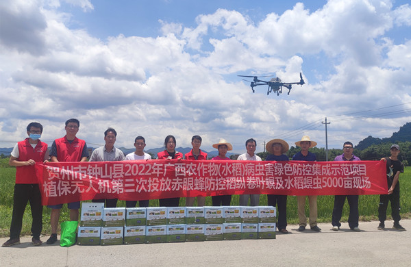 县农业农村局植保站站长冯光春指出:今年钟山县实施广西2022年农作物水稻病虫害绿色防控集成示范项目,在东寨村、泉岭村、东凤村集中连片利用植保无人机开展投放螟黄赤眼蜂防控稻纵卷叶螟及水稻螟虫技术5000亩以上,通过精准实施“放蜂治螟”,将更加先进适用的绿色防控技术运用在我县的农作物上,能有效控制稻纵卷叶螟卵寄生率能达到83.33%,同时农药使用量可以减少18%以上,大大减少了农业面源污染,保护了生态环境。