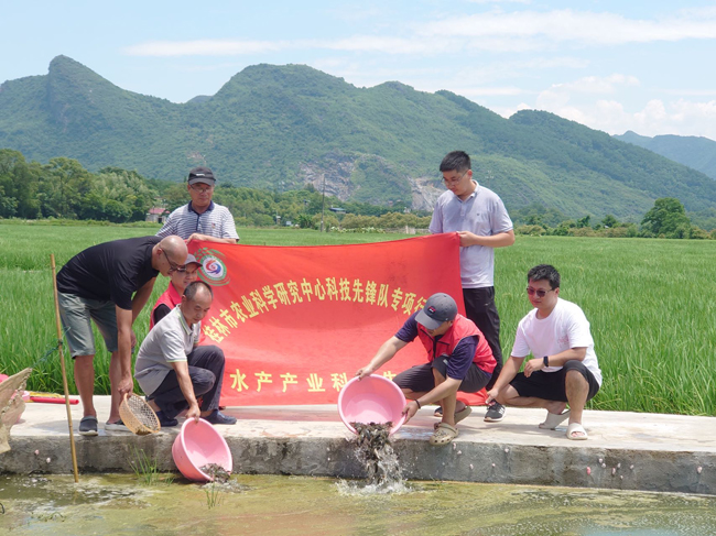 针对地理标志地方特色养殖品种——全州禾花鱼在体色、体型、风味、抗性等方面优异性状退化问题,近年来,桂林市农业科学研究中心水产科技先锋队结合区、市科技项目的试验研究,一直致力于禾花鱼种质保育和品种提纯复壮工作。目前,桂林市农业科学研究中心水产科技先锋队联合全州县稻香禾花鱼养殖有限公司、柳州市万穗农业开发有限公司全州分公司在桂林市雁山区雁山镇、全州县才湾镇、龙水镇建立了禾花鱼种质保种场三个,每年可为社会提供禾花鱼良种一亿多尾,其中为稻渔生态种养提供大规格鱼种两千多万尾。