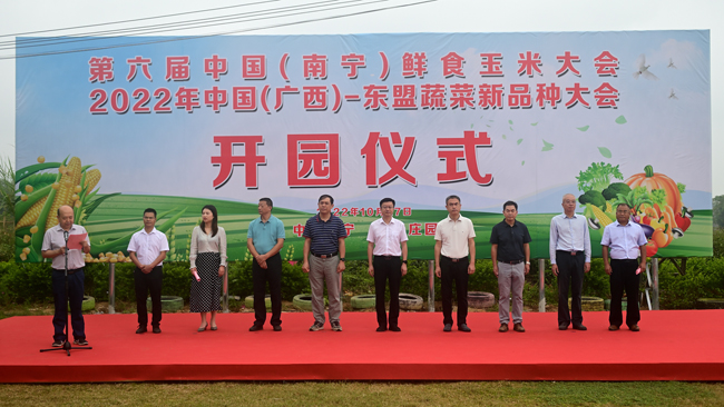 10月28日,自治区党委农办专职副主任、自治区农业农村厅党组成员韦波出席第六届中国(南宁)鲜食玉米大会和2022年中国(广西)—东盟蔬菜新品种大会开园仪式。