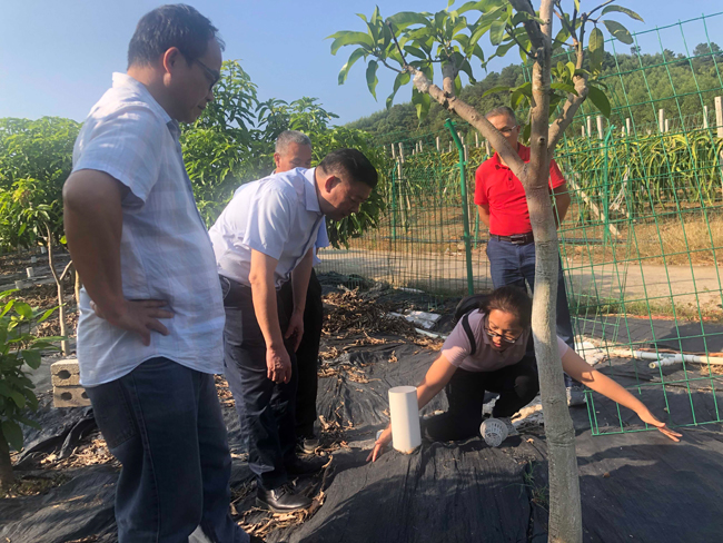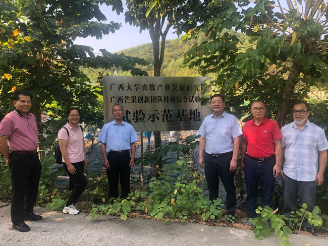 10月29日下午,自治区农业农村厅总农艺师李如平到广西芒果创新团队桂南综合试验站设在南宁花雨湖生态休闲农业示范区的试验示范基地调研指导。