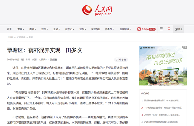 “荷美覃塘 湖美四季”的环境和水质等条件都属一流,这里的小龙虾还未正式上市就已经有人来大批量预订了。“今年,以目前市场行情来看,我们的藕虾销路是不成问题的。目前基地养殖规模很多亩,到正式上市那时,每天可以捞很多斤小龙虾,基本上是供不应求。”对于小龙虾的销路,谢富贵充满了自信。