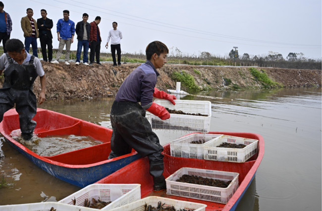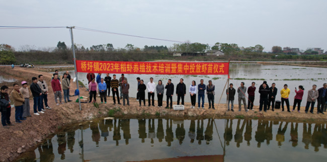 活动当日,桥圩镇在新洞、蒙洞、南兴、杨村等几个村举行集中投放虾苗仪式,一笼笼虾苗被有序地放入塘中。据统计,第一期投放虾苗达3000多斤,预计三月底四月初可以产出15000斤左右的成品虾。