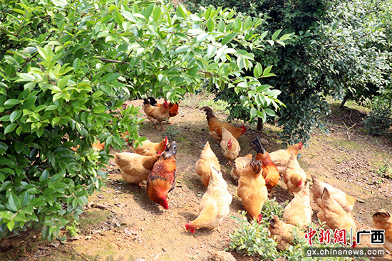 在藤县濛江镇新安村的藤县富绿山畜牧有限公司养殖基地,一只只羽毛油亮的土鸡在油茶树下欢快觅食。藤县融媒体中心供图