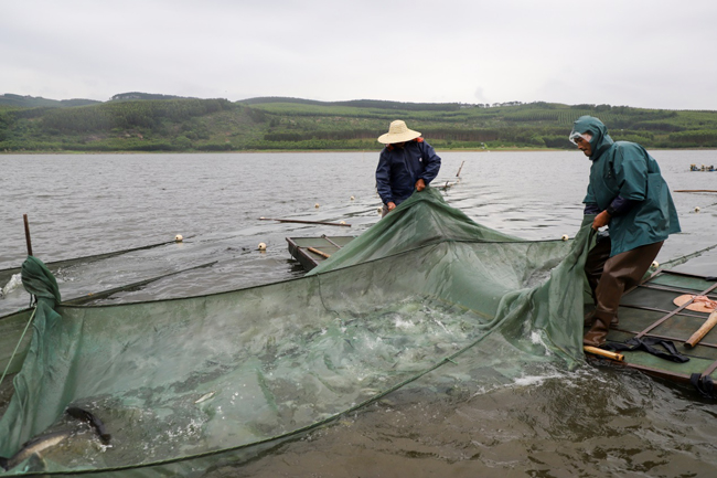“这个水库面积有500多亩,主要是养麦鲮鱼,投放有2000万尾,还有部分罗鱼、鲢鱼,年初打了一次鱼,得了26万斤。这次已经打了一个星期,得了10多万斤,主要销往四川、重庆和湖南等地,希望今天继续大丰收。”水产养殖户覃仕福高兴地说。