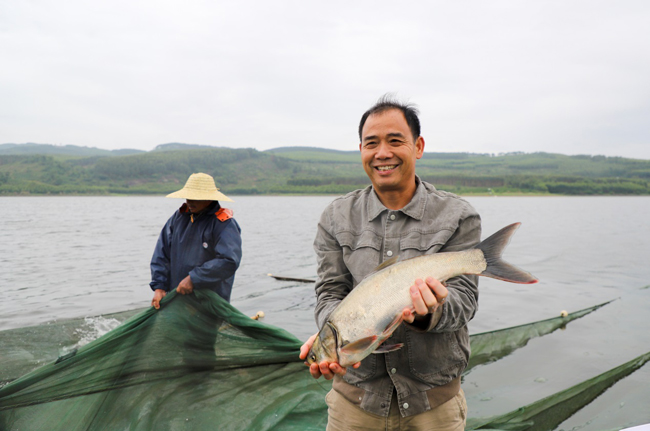正在现场等待拉鱼的老板韦卓芳说:“我从柳州过来的,这几天已经拉这个水库的鱼4车了,共拉了4万多斤,现在是第5车,这里的水质非常好,鱼非常漂亮,品质又好,客户非常喜欢。那边老板、客户已经把这里的麦鲮鱼等订完,现在装车到一半,装完又发车到武汉。”