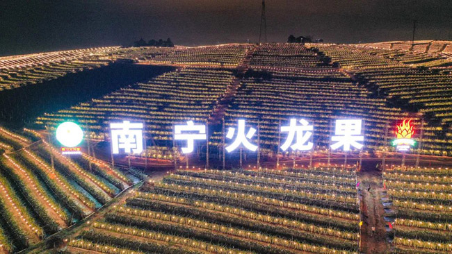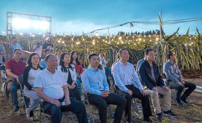 随着张庆军处长宣布:“南宁火龙果地理标志农产品再提升项目“南宁火龙果”大型广告牌建设完成,今天正式投入使用,请亮灯!”整个火龙果基地亮起的灯光灿烂辉煌,如同夜空中的银河铺满大地,“南宁火龙果”的字样仿佛最耀眼的明珠点缀在星辰大海,更显得基地壮美辽阔。