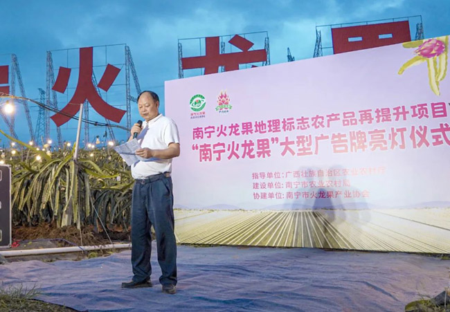 日前,南宁火龙果地理标志保护再提升项目“南宁火龙果大型广告牌亮灯仪式”在南宁市隆安县那桐高速路旁的广西龙穗农业有限公司基地举行。本次活动由南宁市农业农村局主办、南宁市火龙果产业协会协办。自治区农业农村厅安监处张庆军处长、广西绿色食品发展站莫建军站长和梁自力书记、南宁市农业农村局廖磊副局长、隆安县农业农村局黄其捷局长、南宁火龙果协会陈修华会长等出席了仪式。