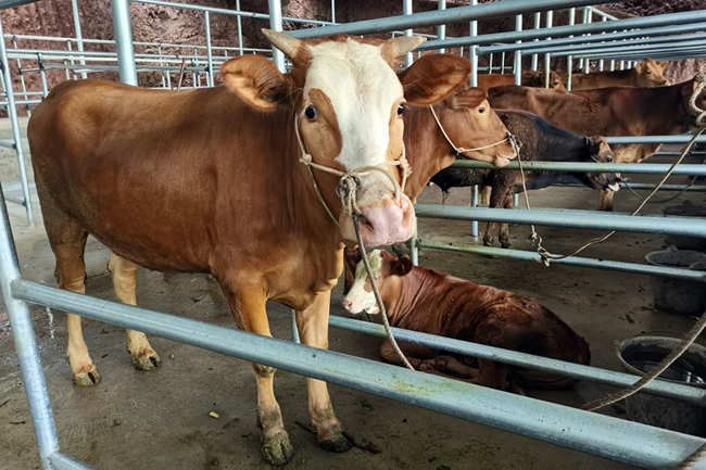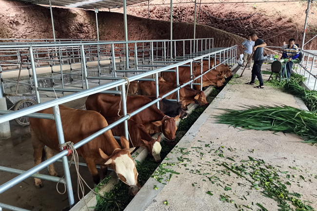 走进六王镇大公村广西容县领兴盛农业有限公司的养牛场,这里群山环抱、林木葱茏,清风徐徐,一座新建的牛棚置于山林中。牛棚里一排排崭新的钢结构牛棚架整齐排列,十几头利木赞种牛和小牛在棚里或站或卧,时不时发出哞哞叫声。“利木赞牛又称改良肉牛,其前后肢肌肉丰满,出肉率高,在肉牛市场上很有竞争力。”该公司的董事长钟琳芸介绍。牛是食草动物,为此公司承包了村民闲置土地种上玉米和牧草,利用牛粪作为有机肥料发展种植业,发展绿色循环经济。