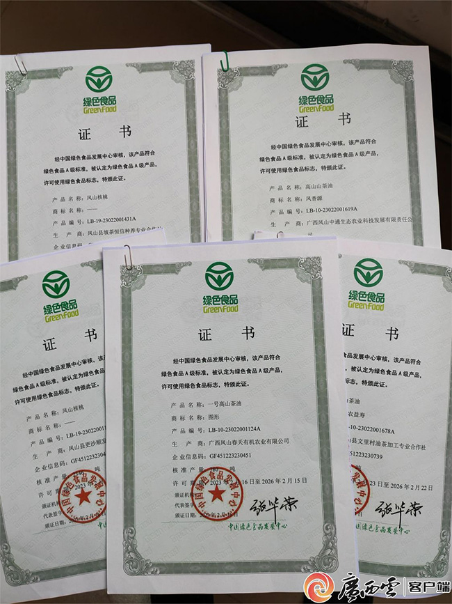 近日,河池市凤山县宏星核桃专业合作社喜获“凤山核桃”“山茶油”两个绿色食品证书。