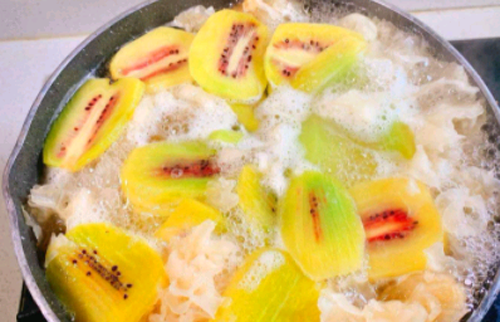 详细做法:首先,把猕猴桃去皮切成小块备用;银耳冲洗干净后,放入水中泡发;锅中加入适量的清水,再加入泡发好的银耳,适量的冰糖,大火煮沸后改小火慢炖,煮至银耳胶质感浓稠时,再加入切好的猕猴桃块,接着改大火再煮五分钟即可出锅!