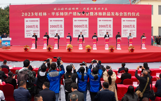 11月8日,2023年桂林·平乐柿饼产销推介会暨冰柿新品发布会在广西平乐县桥亭乡举行。来自国内40余家柿(饼)销售客商、电商运营平台线上线下700余名代表与当地100余家柿饼加工企业代表、近1000名柿农齐聚盛会,共享平乐盛“柿”,共谋平乐发展,现场交易签约8亿元。