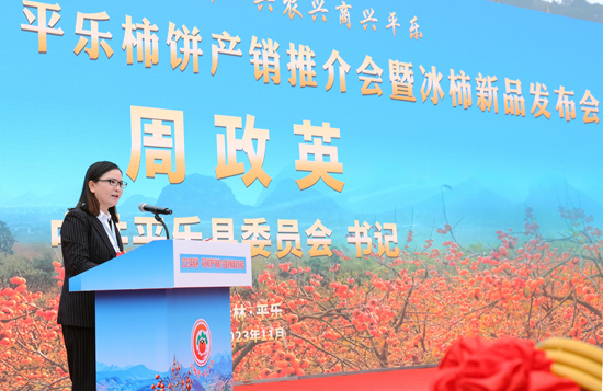 平乐县委书记周政英在柿饼产销推介会上致辞。苏桂摄