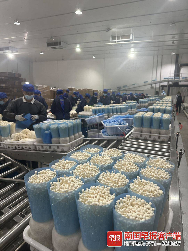金针菇达到采收标准后,自动化流水线会将它们送至包装车间,进行采收、分拣和包装等处理。在食用菌包装车间,包装好的金针菇成品通过冷链物流走向市场。据悉,该工厂还种植了鹿茸菇、海鲜菇等食用菌,全年不间断。