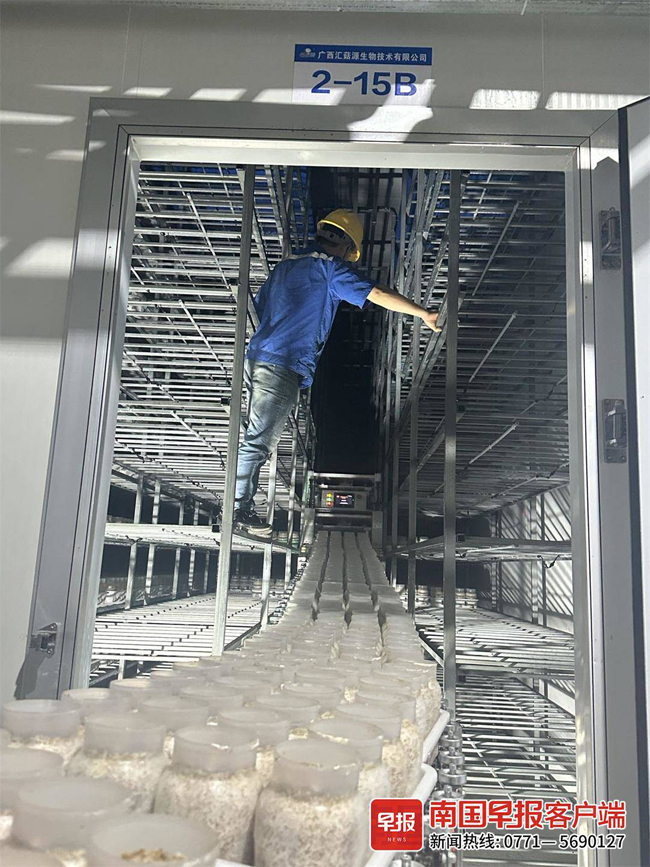 当天,在贵港市港北区某食用菌企业里,只见工人通过自动传送带,将已培养好的一排排金针菇栽培瓶,送进伸手不见五指的种植车间,在8层的床架上整齐排列。在这里,金针菇享受着数字化技术控制的温、光、水、气等智能模拟自然条件。