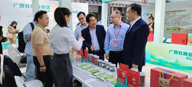 同时,此次招商推介会还举办了广西县域特色产品展,来自广西的永福罗汉果、北流百香果、三江富硒红茶、陆川扣肉、北海南珠、河池蚕丝被、梧州六堡茶等一众“桂”品琳琅满目,让人目不暇接。在20多个展位前,参展企业通过产品陈列、人员介绍、现场品尝等方式,积极推介来自广西的特色产品,消费者们对广西的特色农产品赞不绝口,粤港澳大湾区的客商也主动与参展企业洽谈沟通,加强合作。