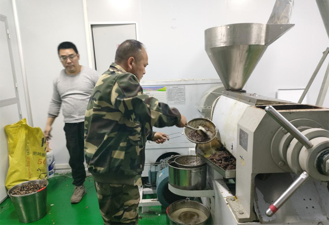 黄喜新说,今年天气很好,采摘下来的油茶果已经晾晒干了,每天都有村民过来榨油。目前,油坊共有2台榨油机,1台灌装机,年加工茶油20多吨。