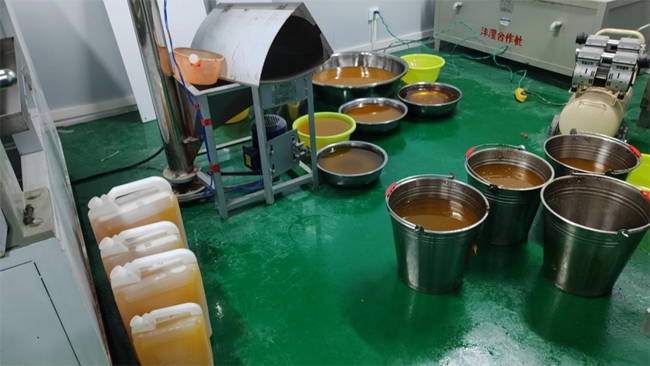 在榨油坊里,一桶桶茶籽粉经过碾、蒸、压等多道工序,金黄色的茶油源源不断地流出来。油坊负责人黄喜新告诉笔者,这种依托现代机械、通过物理压榨出来的茶油保质期长、营养价值高,深受市场青睐。