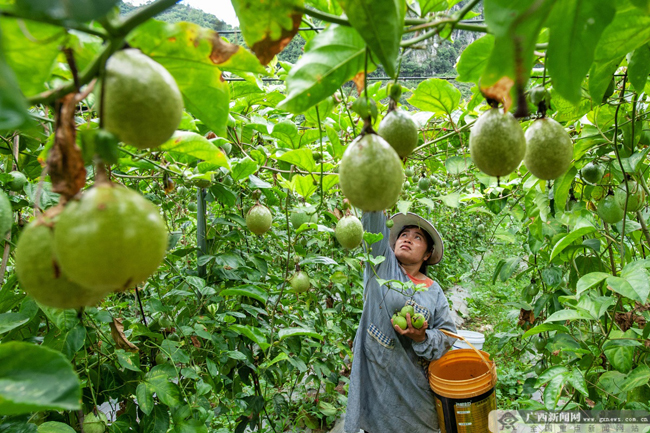 在靖西市同德乡东球村百香果种植基地,村民在采摘百香果。赵京武 摄