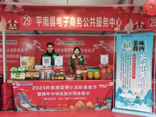 2月23日至24日,由中共贵港市委员会、贵港市人民政府主办的2024年贵港富硒小龙虾美食节暨铸牢中华民族共同体意识“我们的节日·元宵”嘉年华主题系列活动在平南县江北公园明珠楼旁举行。平南县电子商务公共服务中心(简称公服中心)工作人员精心挑选平南县区域公用品牌“荟味龚州”的系列产品参展,向广大群众展示了“荟味龚州”区域公用品牌的独特魅力和平南县农特产品的优越品质。