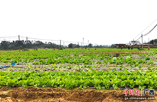 还未走到,远远地就能看到一片绿油油的田地。一颗颗茎壮叶肥的芥菜肆意生长,畅享春日美好时光。田垄上,摆满了一排排已经被采收下晒蔫的芥菜,几名工人把这些芥菜统一收集起来装袋,送到路边的货车上,运往柳州、玉林、梅州等地。芥菜具有生长周期短、种植难度低、产量高等特点,在每年水稻收割完以后进行种植,让土地得到最大化利用,增加经济效益。