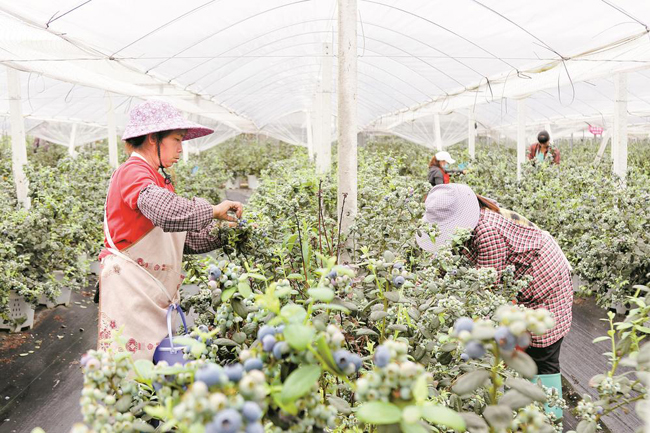 工人在大棚内采摘蓝莓。