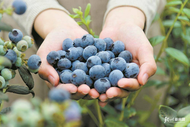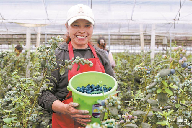 工人展示蓝莓,开心又自豪。