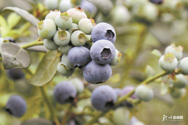 成熟蓝莓挂满枝头,犹如一颗颗“蓝宝石”。