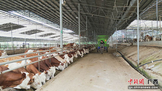 广西桂平骏盈农业技术有限公司负责人李锐表示,养殖场占地面积46亩,牛舍面积约2万多平方米,存栏大约1千多头牛,品种有西门塔尔、安格斯、利木赞,这些品种的牛骨架较大,肉质好,经济效益高,牛场采用的是自繁自育的经营方式,这样的方式有利于降低采购的成本和风险,同时基地还扩展了一千多亩土地来种植牧草,大大降低饲养成本。