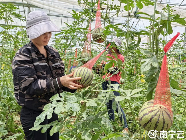 6月12日,当记者走进青秀区晟发现代设施蔬菜基地的温室大棚时,几名工人正在忙着采摘麒麟美都西瓜,与种植在地里的爬藤大西瓜不同,这里的西瓜只有巴掌大小并且采取垂直种植的现代农业方式。小小的甜西瓜不仅为夏日带来了一丝凉爽和惬意,更成了当地丰收致富的“甜蜜经济”。