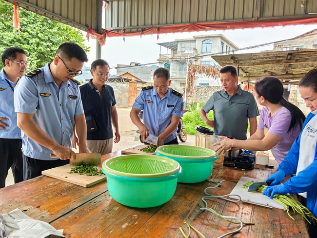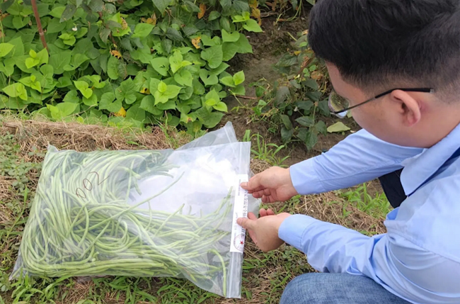 日前,农业农村部热带农产品质量检验测试中心(海南)技术人员到柳江区开展国家豇豆专项监督抽查工作,广西农业农村厅综合执法局四级调研员胡明钰、农产品质量安全监管处高级农艺师李国栋、柳州市农业农村局质量安全与法规科科长张欣、农技中心质量安全指导科科长李翔和柳江区农业农村局分管领导咸剑陪同抽查。