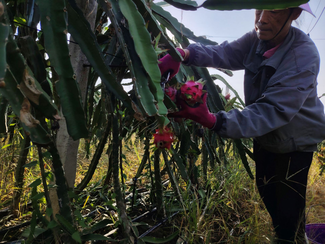 近段时间以来,在高温天气的影响下,火龙果转色很快,长期有合作关系的江浙地区采购商看到周少全微信朋友圈里晒出的火龙果图片,纷纷主动登门求购。据了解,周少全一周内已经接到了3个订单,发送了3批次货车,也有一些零散客户慕名前来果园采摘。周少全说:“今年我种植了500多亩火龙果,亩产2000公斤,每公斤均价4元,基地一次性采摘产值400多万元。像今年这种晴好天气,一年预计可以采摘10批次,年产值4000多万元。”