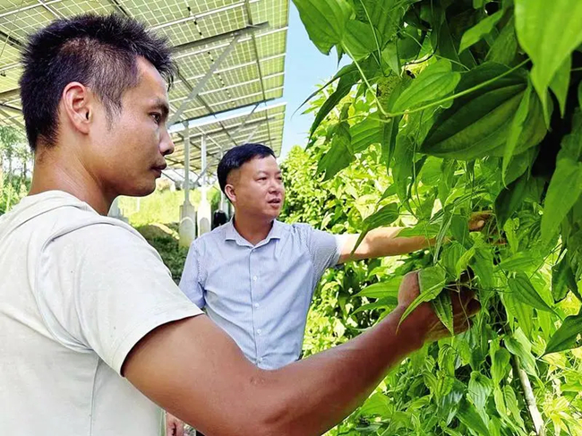 夏秋时节,骄阳似火,走进马山县周鹿镇南邦村的中草药种植基地,一排排整齐划一的光伏板在蓝天白云下熠熠生辉。而在这片“钢铁森林”之下,却是一个生机勃勃的绿色世界。农户们头戴草帽,手持工具,正忙碌地进行管护工作。