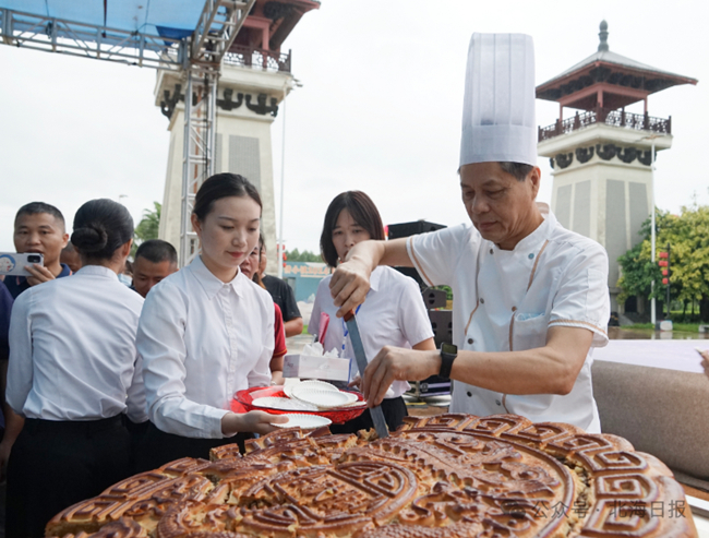 月饼师傅为群众切分重达201.7斤的大月饼。石海涛 摄