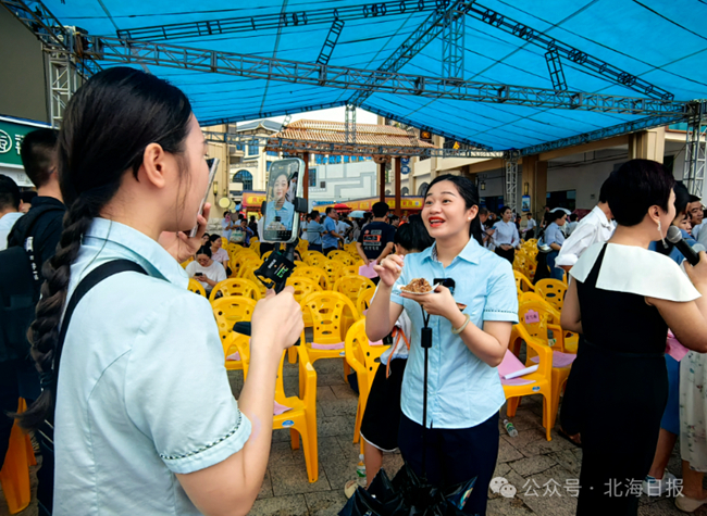 市民边品尝大月饼边进行直播。翟坚求 摄