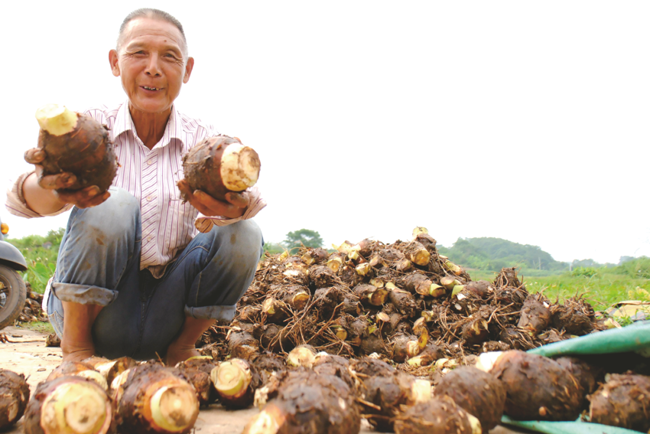 手捧新鲜采摘的芋头,村民喜笑颜开。