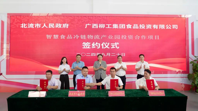 近日上午,北流市在“两湾”产业融合发展先行试验区招商中心举行智慧食品冷链物流产业园投资合作项目签约仪式,推动全市经济结构进一步优化、现代化产业体系建设进一步加快。自治区国资委二级巡视员王洁,广西柳工集团有限公司党委书记、董事长郑津,北流市委书记刘启出席签约仪式。