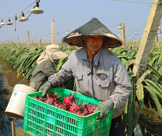 据了解,目前广西金穗农业集团火龙果种植面积达到13000多亩,今年已经收获第八批果,目前正在采收的是第九批,预计今年可以达到14个批次,每亩总产量9000斤左右,由于产量和品质的提升,今年每斤价格可以达到1.8元以上。